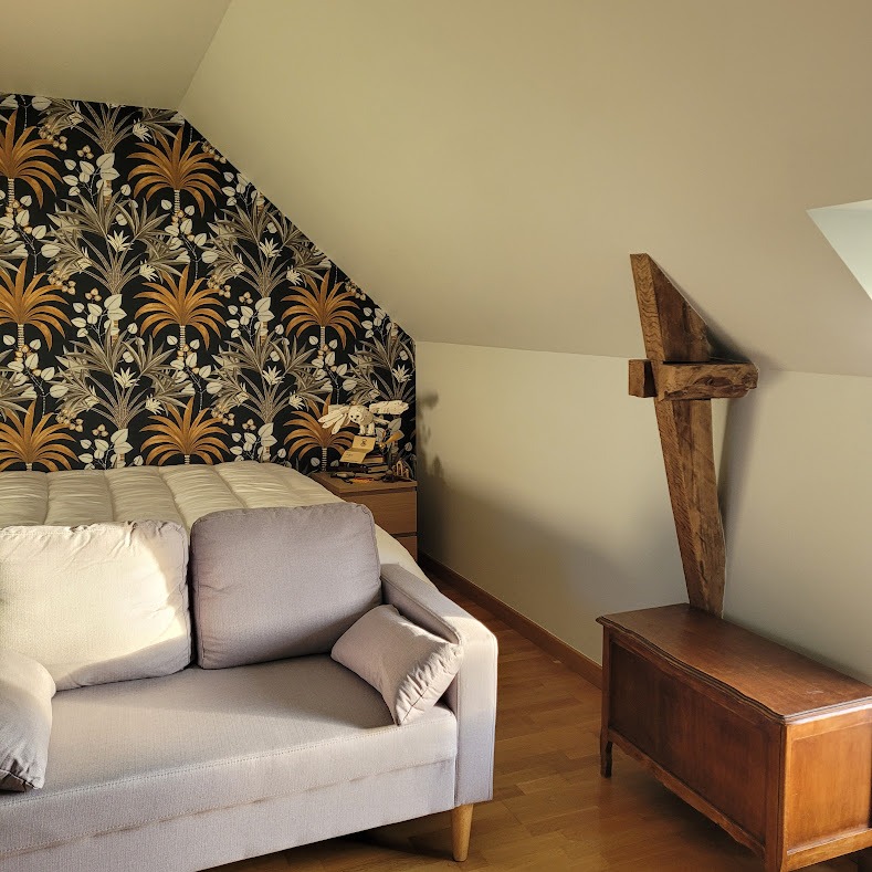 Pose d’un papier peint Casamance, collection Aventura, en tête de lit : une touche de caractère qui donne tout le style à la pièce 😍